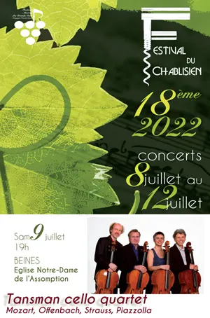 Concert avec Tansman Cello Quartet (Quatuor de violoncelles / oeuvres de Mozart, Offenbach, Strauss, Piazzolla) dans le cadre du 18ème Festival du Chablisien – Beines (Eglise Notre-Dame de l’Assomption)